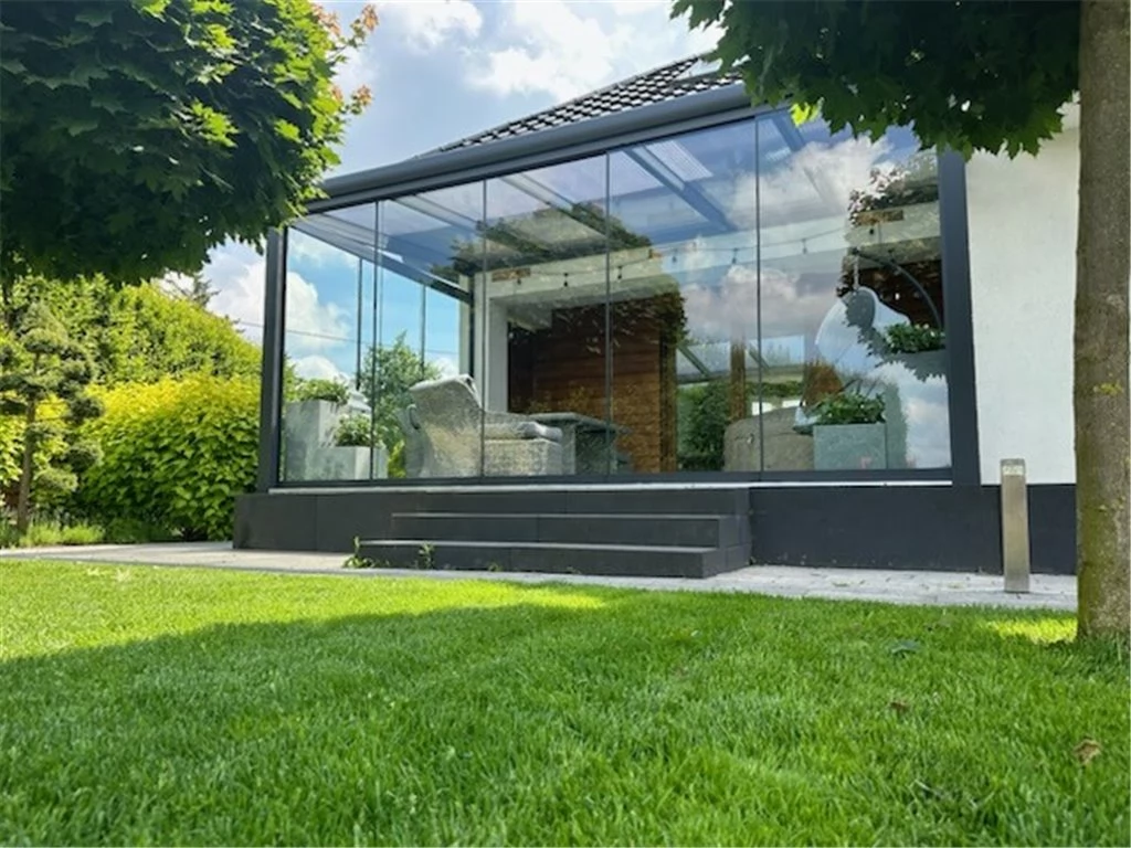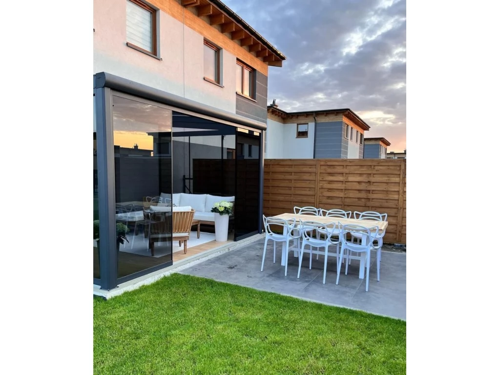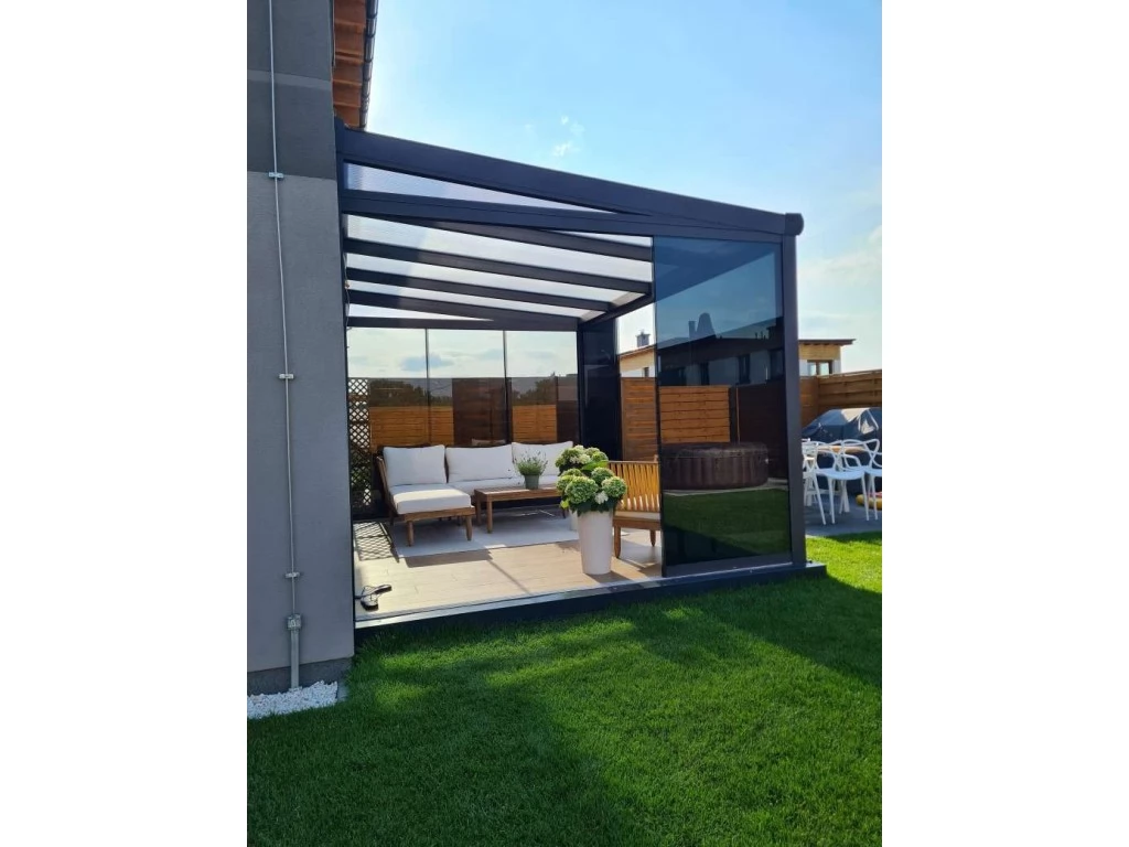 Zadaszenie wraz z systemem przesuwnym jest nowoczesne i bardzo wytrzymałe. Szyby mogą być wyposażone w szczotko-uszczelki dzięki czemu w pozycji zamkniętej ogród nie jest narażony na działanie wiatru.