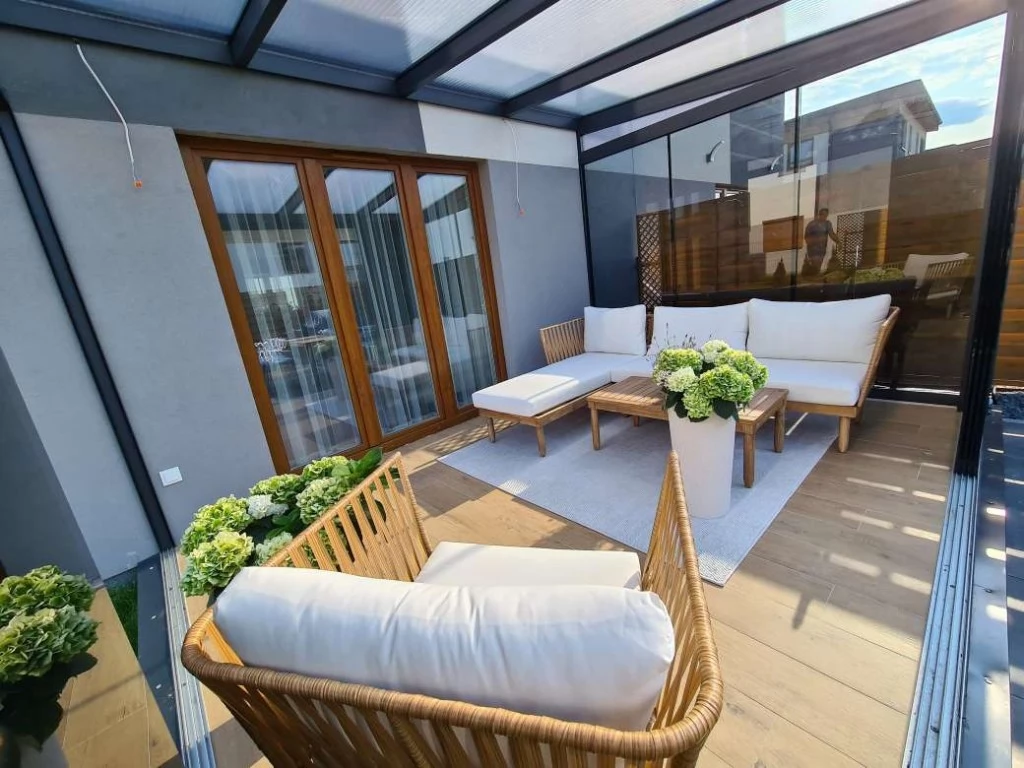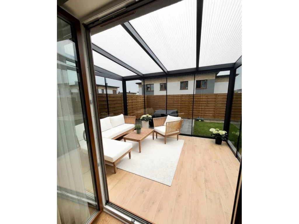 Ogród zimowy Modern PRO+ jest wykonany z solidnych profili aluminiowych, pokrycia dachowego z płyt poliwęglanowych o grubości 16mm i systemu przesuwnego ścian, który wykonany jest z wytrzymałego szkła hartowanego o grubości 10mm.