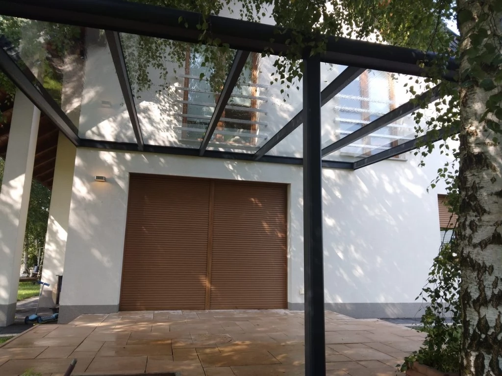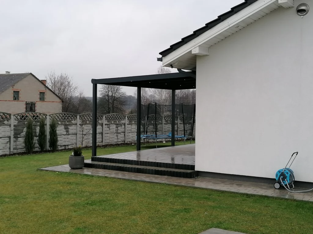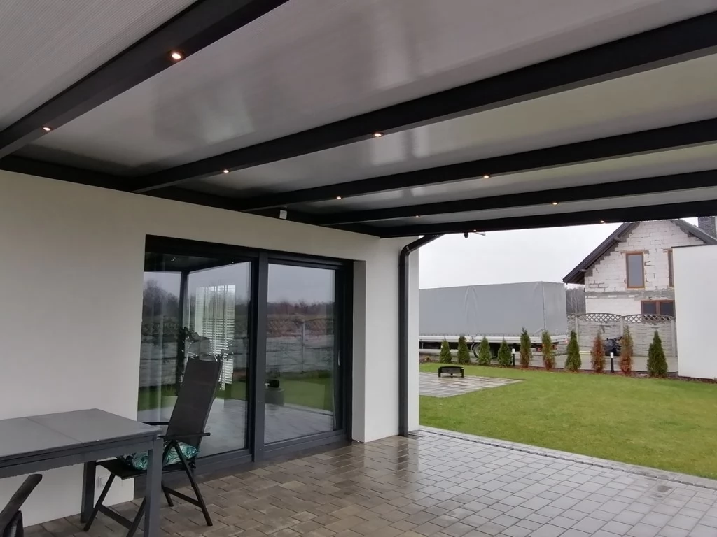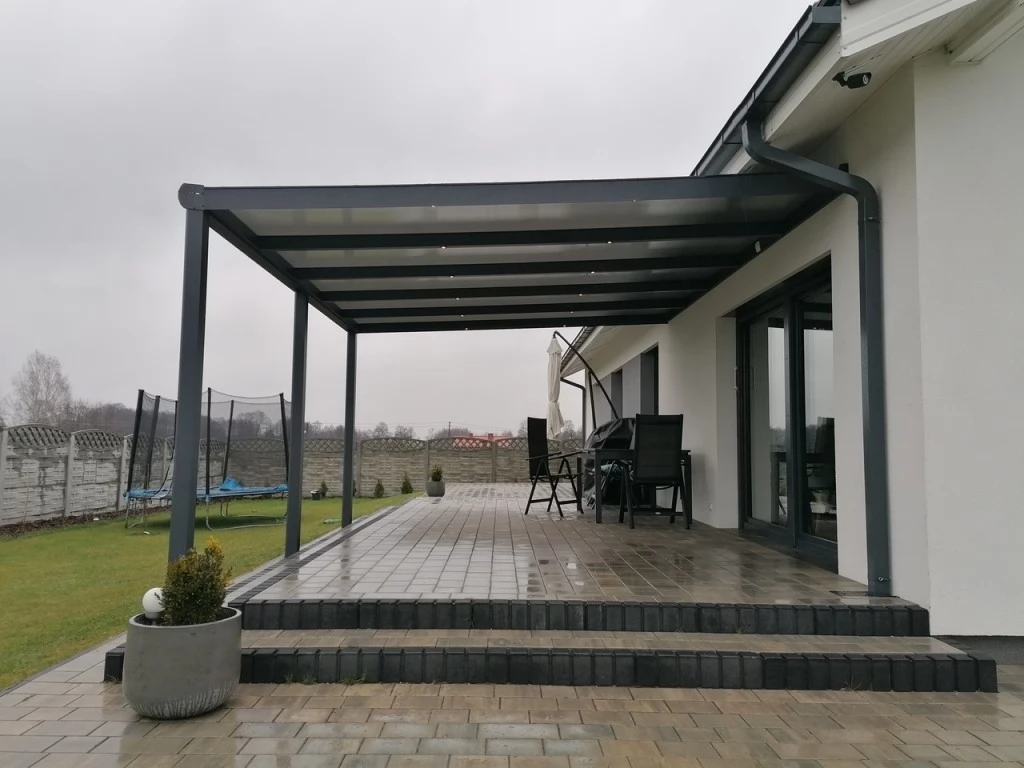 Boki zadaszenia można wyposażyć w nieotwieralne ściany z płyt poliwęglanowych chroniących przed wiatrem oraz przed widokiem z sąsiednich działek
