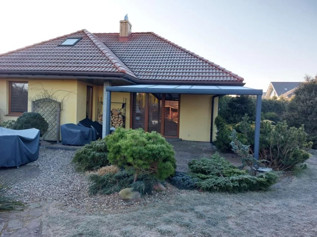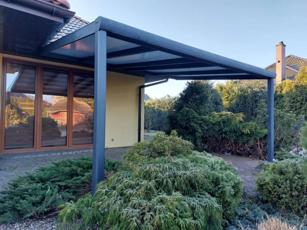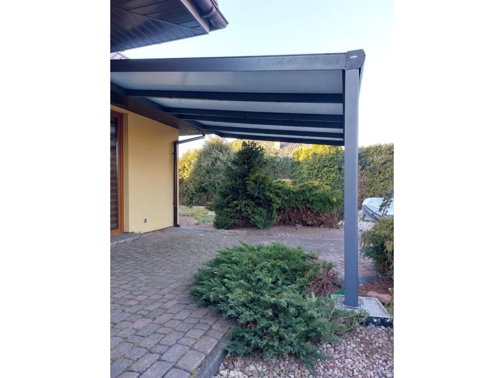 Boki zadaszenia można wyposażyć w nieotwieralne ściany z płyt poliwęglanowych chroniących przed wiatrem oraz przed widokiem z sąsiednich działek